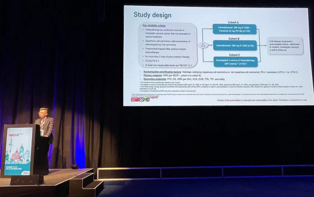有望为宫颈癌患者带来治疗新选择10月22日,k8凯发天生赢家·一触即发医药创新药卡瑞利珠单抗联合法米替尼对比卡瑞利珠单抗单药或研究者选择的化疗治疗复发转移性宫颈癌随机、开放、对照、多中心的Ⅱ期临床研究(SHR-1210-Ⅱ-217) 亮相2023 ESMO大会简短口头报告现场3。该研究由复旦大学附属肿瘤医院吴小华教授团队开展,吴小华教授在现场公布了该重磅研究进展。研究结果显示,在既往以铂为基础化疗失败后复发或转移性宫颈癌患者中,与单独使用卡瑞利珠单抗或研究者选择的化疗相比,卡瑞利珠单抗联合法米替尼显著提高了抗肿瘤活性,安全性可控,有望为晚期宫颈癌患者提供新的治疗选择。